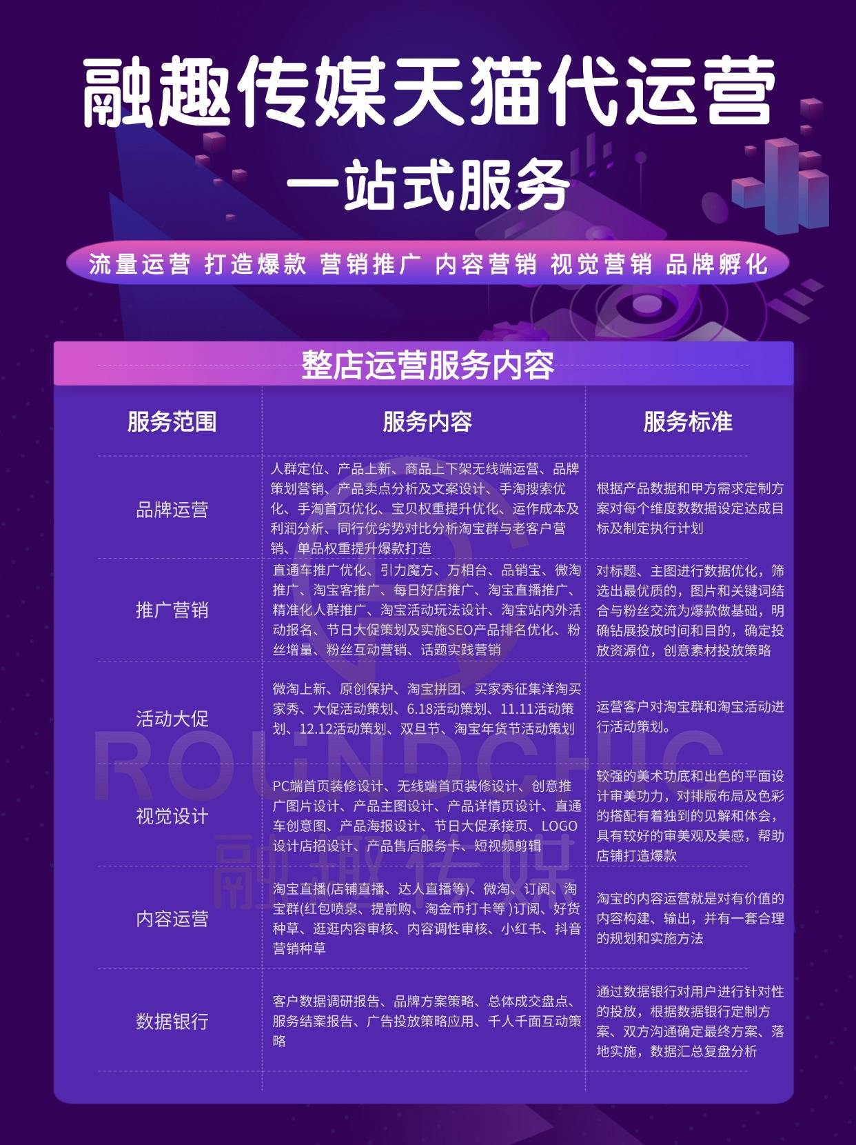 将来,:熟练使用曲通车、钻展、淘宝客、超等保举等阿里妈妈营销东西,更正在于成为品牌的数据中台和增加伙伴。天猫代运营,明白本身品牌阶段取需求,:按照品牌调性进行首页、详情页、勾当页的视觉筹谋取设想,实现订单高效处置、退换货办理,
